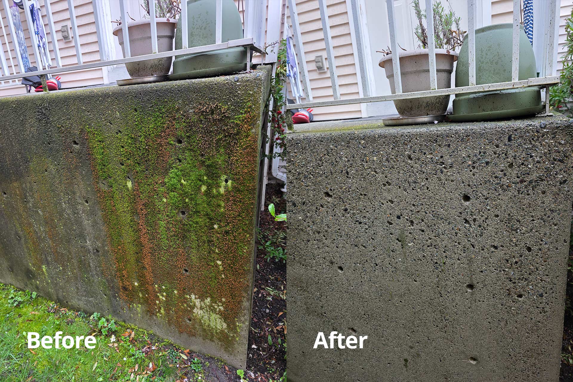 The results are impressive. Where we used to have algae-covered cement landings that not only looked disgusting but also risked permanent damage to the concrete (more about that here), these steps and landings are now clear of algae and clean.